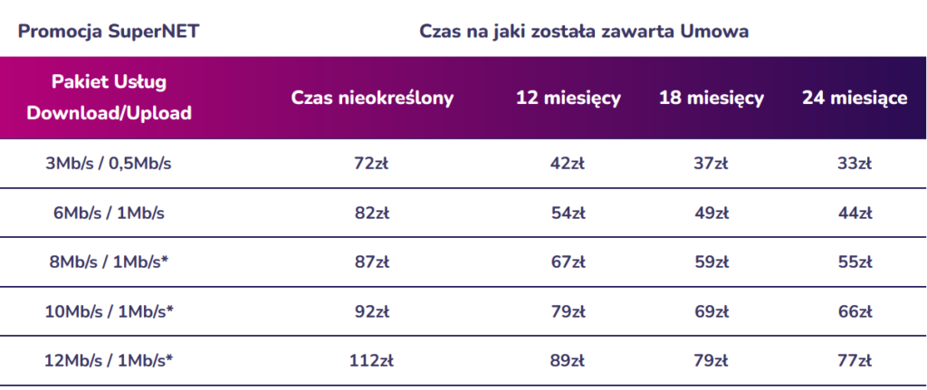 *Przy Umowie dla NOWEGO KLIENTA pobierana jest jednorazowa opłata aktywacyjna w wysokości 99,00 zł przy prędkości 15 i 20Mb/s oraz 149,00 zł przy prędkości 30 i 50Mb/s